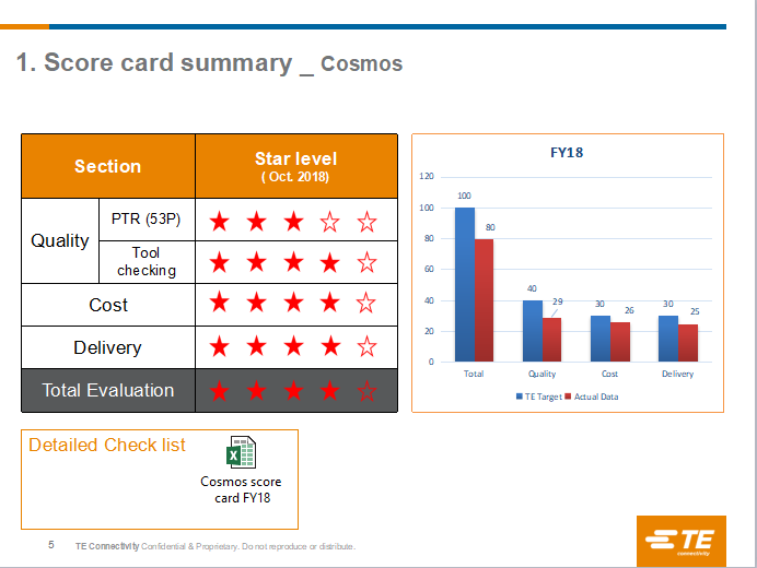 今年通过全体同仁的努力与付出,获得了TE客户对我们的评价,我们已经正式成为TE客户的4星级战略供应商。在这里,我代表项目一部,感谢大家今年来对TE项目的支持,这是大家的成绩,希望接下来,大家一如既往的对TE项目的支持,向终极目标奋斗,力争成为TE客户5星级精英供应商。